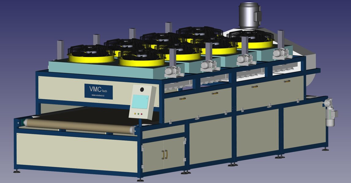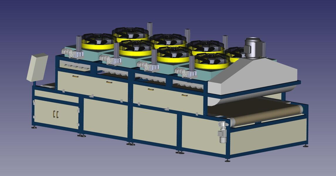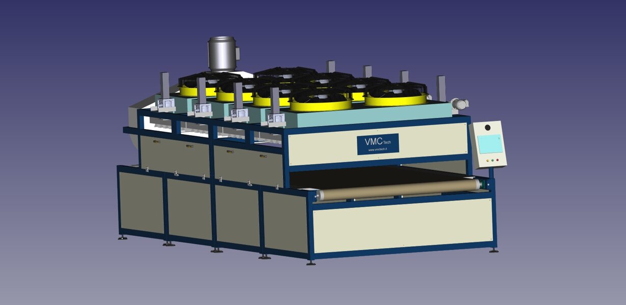 Nuovo progetto per un essiccatore a infrarossi per superficie e per la polimerizzazione. Equipaggiato con una potenza totale di infrarossi pari a 48Kw.
